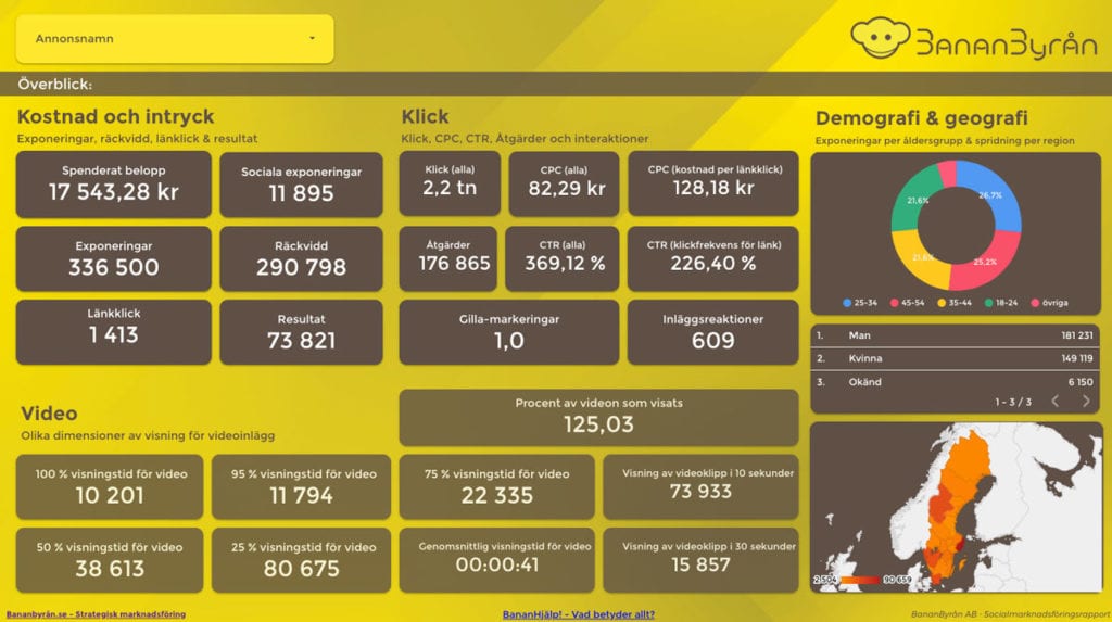 Antalet gånger dina annonser visades/har visats på en skärm för vald åldersgrupp/målgrupp samt fördelat efter kön. Okänd innebär att användaren inte valt att visa sitt kön i sin profilinställning.